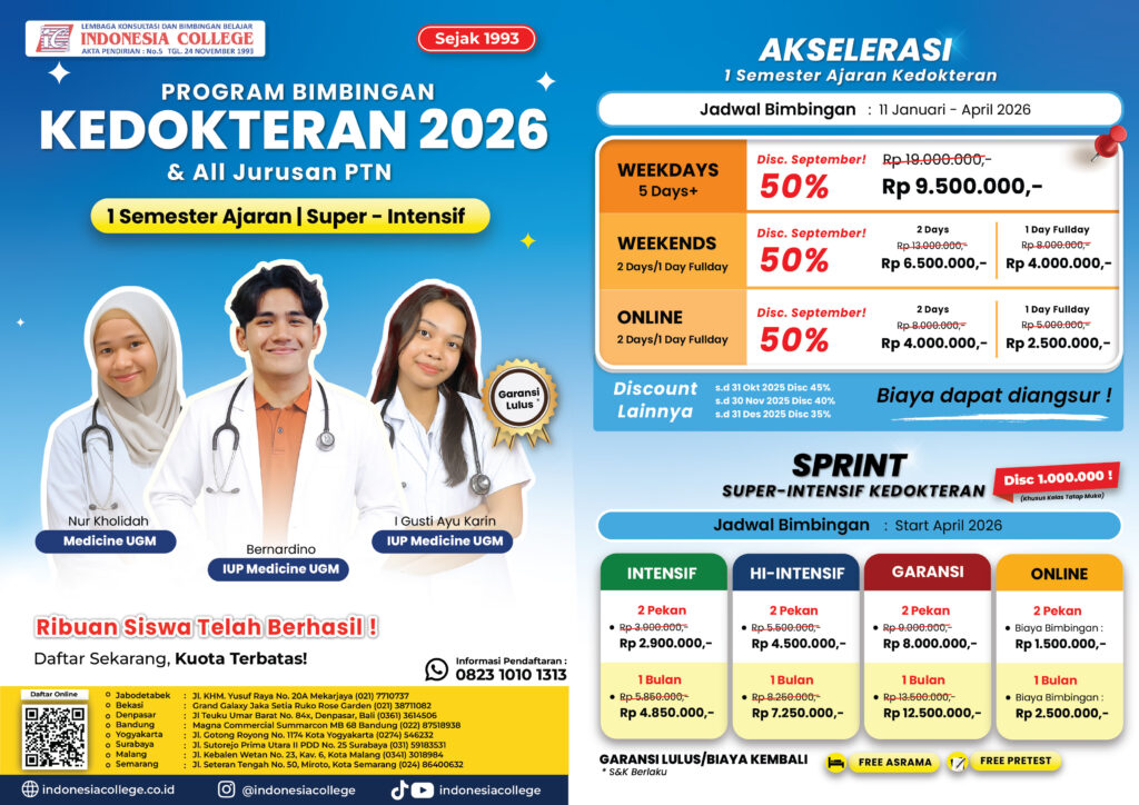 Sebagai Lembaga Konsultasi dan Bimbingan Belajar khusus masuk kampus yang telah berdiri sejak 1993, Pengalaman INDONESIA COLLEGE selama lebih dari 31 Tahun menjadi jaminan kualitas dan layanan, untuk meluluskan siswa ke perguruan tinggi impian.