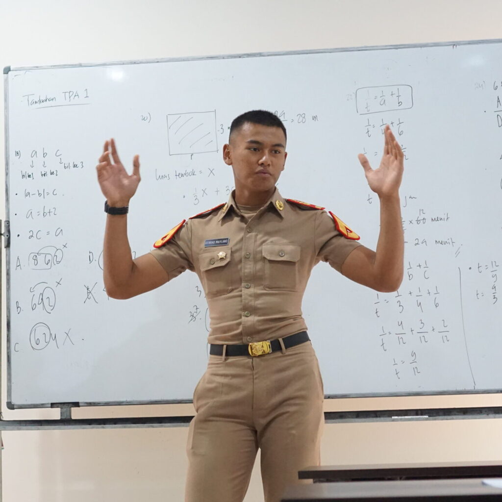 Anda akan dibimbing sesuai dengan materi tes seleksi Sekolah Tinggi Kedinasan yang dituju. Pemberian pelatihan-pelatihan untuk tes fisik (KESAMAPTAAN & BINJAS/BINSIK) serta pelatihan untuk mengahadapi Tes Wawancara dan Psikotes mirip dengan materi yang akan diujikan nantinya.
