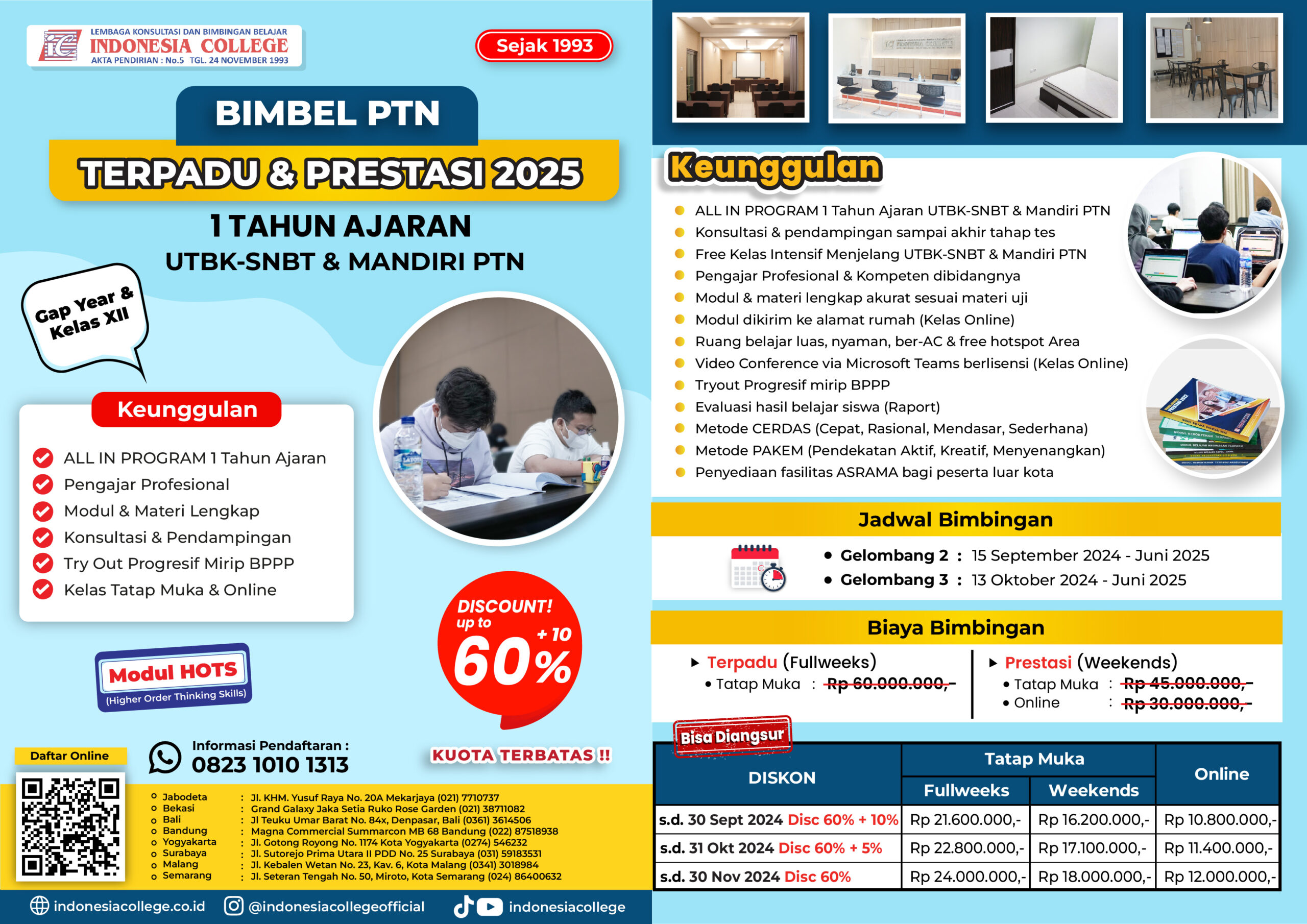 Dengan soal-soal prediksi 99% akurat, simulasi tes 99% mirip, dan terarah, dibimbing oleh ahlinya, sehingga peluang diterima maksimal. Indonesia College memiliki kapasitas, kualitas, pengalaman dan layanan yang memadai guna mendukung serta untuk mendampingi Anda menembus bangku perkuliahan kelas international